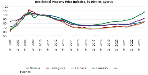 Regional activity is uneven, with the highest rental rate increases recorded in the Limassol district, significantly surpassing those in other districts and well above the national average.