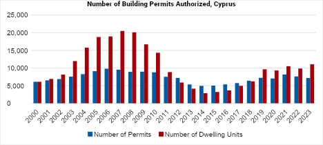 Increasing occupancy of Cyprus’s housing stock indicates a tilt towards demand in the demand-supply balance of the market, pushing housing prices up. Despite a slight decrease in residential building permits authorized in 2023, there was a rise in both the number of dwellings and the value of permits, suggesting a shift towards larger, multi-unit developments. The trend continued into early 2024.