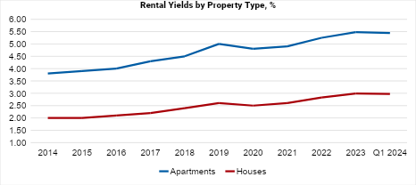 In terms of price dynamic by property type, apartments demonstrated a higher growth of 12.7% year-on-year (10.9% inflation-adjusted), while houses grew more moderately at 5.7% year-on-year (4.0% inflation-adjusted) as of Q4 2023.