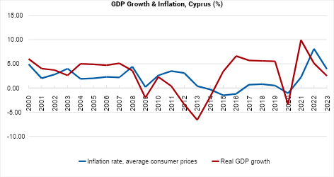 Overall Cypriot economy, supported by robust policies, has demonstrated resilience to multiple adverse shocks. Although moderated to 2.5% in 2023, the country’s GDP growth was supported by domestic demand and rising employment in an environment of inflation approaching target levels and declining to 2.9%. The 2024-2025 outlook remains positive, as economic activity is expected to grow on the back of strong domestic consumption and further improving net exports.
