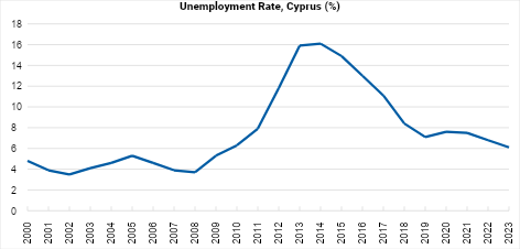 Cyprus’s labor market is strong, serving as one of key factors supporting the ongoing macro-economic growth. In the first quarter of 2024, the unemployment rate in the country was registered at 6.0%, according to the Labor Force Survey figures provided by CYSTAT, down from 6.8% in the corresponding period of 2023. European Commission forecasts the unemployment rate to continue downwards trajectory reaching 5.6% in 2024 and 5.4% in 2025, expecting the labor force to be reinforced by foreign workers as domestic labor shortages persist.